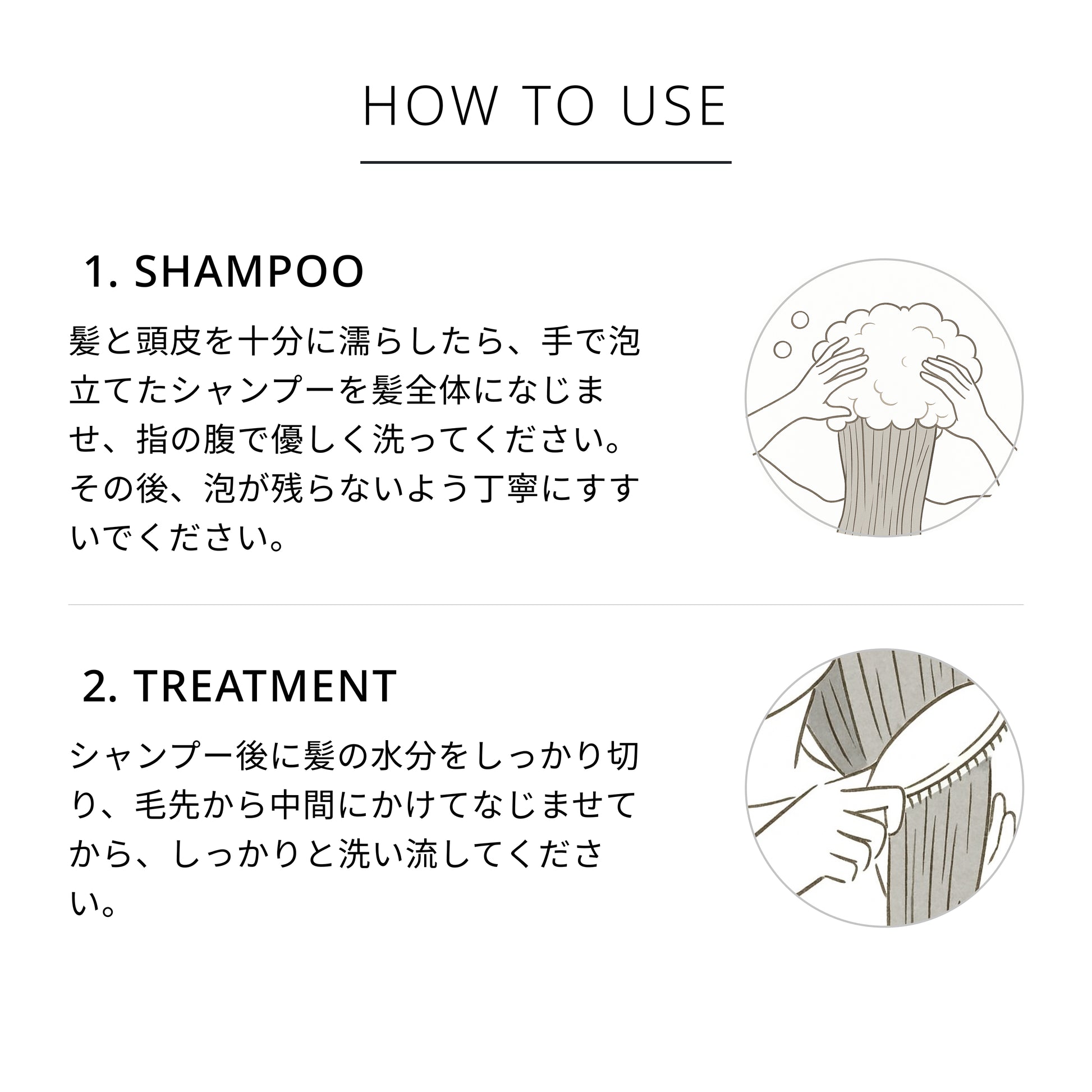 シャンプー後に髪の水分をしっかり切り、毛先から中間にかけてなじませてから、しっかりと洗い流してください。